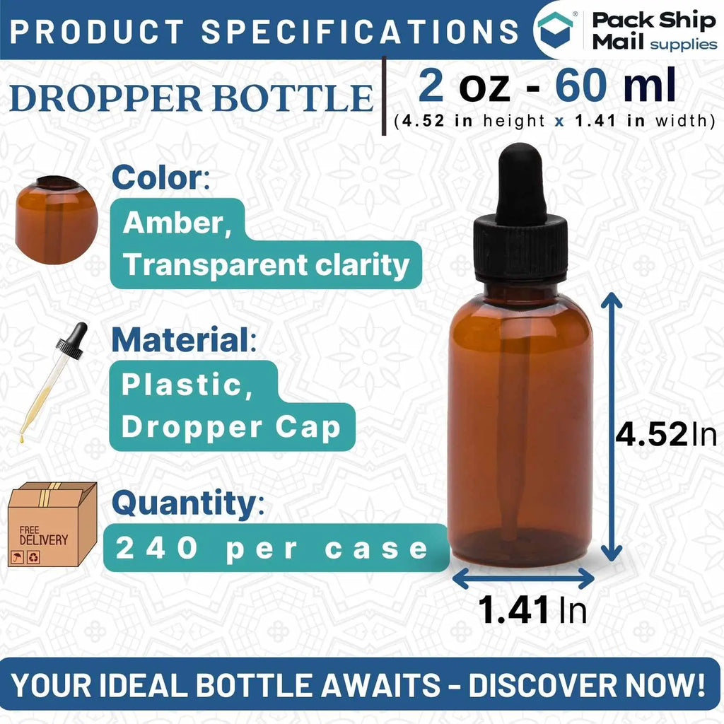 2 Oz Amber Dropper Bottle 240 Per Case – A necessity for precise and secure liquid storage. These lightweight plastic bottles replicate the classic amber glass appeal, offering a durable and budget-friendly solution. Their UV-resistant design protects light-sensitive contents such as essential oils and tinctures, ensuring their quality remains intact. The integrated dropper enables accurate and effortless dispensing, making it perfect for controlled application. This case of 240 bottles provides a cost-effective choice for both personal and professional use. Safeguard and dispense your valuable liquids with confidence using our plastic amber dropper bottles.
